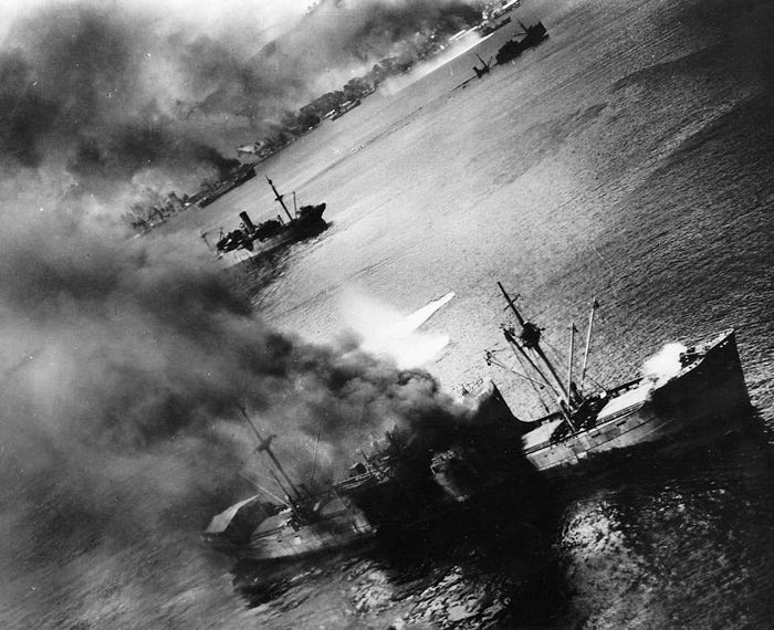Japanese transport ships in the harbor at Rabaul suffer hits and near misses from U.S. bombers.