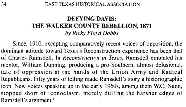 The East Texas Historical Journal offers another article “Defying Davis: The Walker County Rebellion, 1871 Ricky F. Dobbs.”